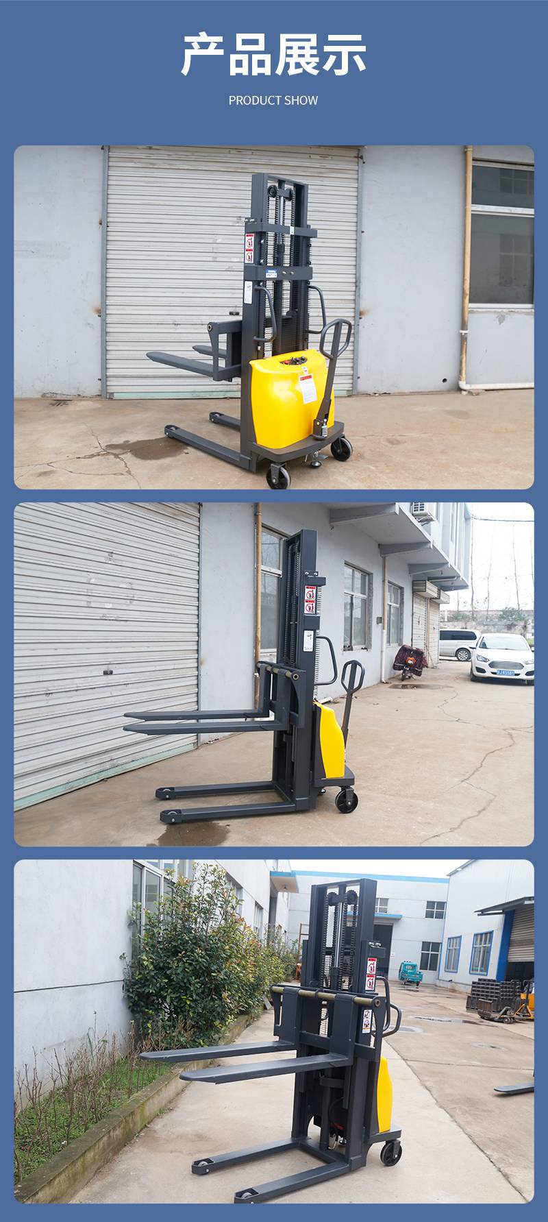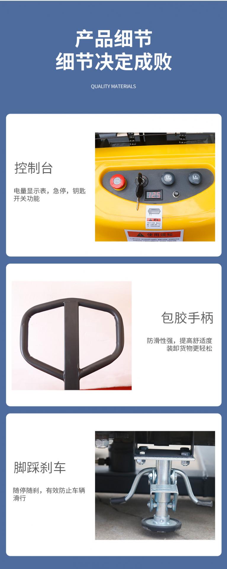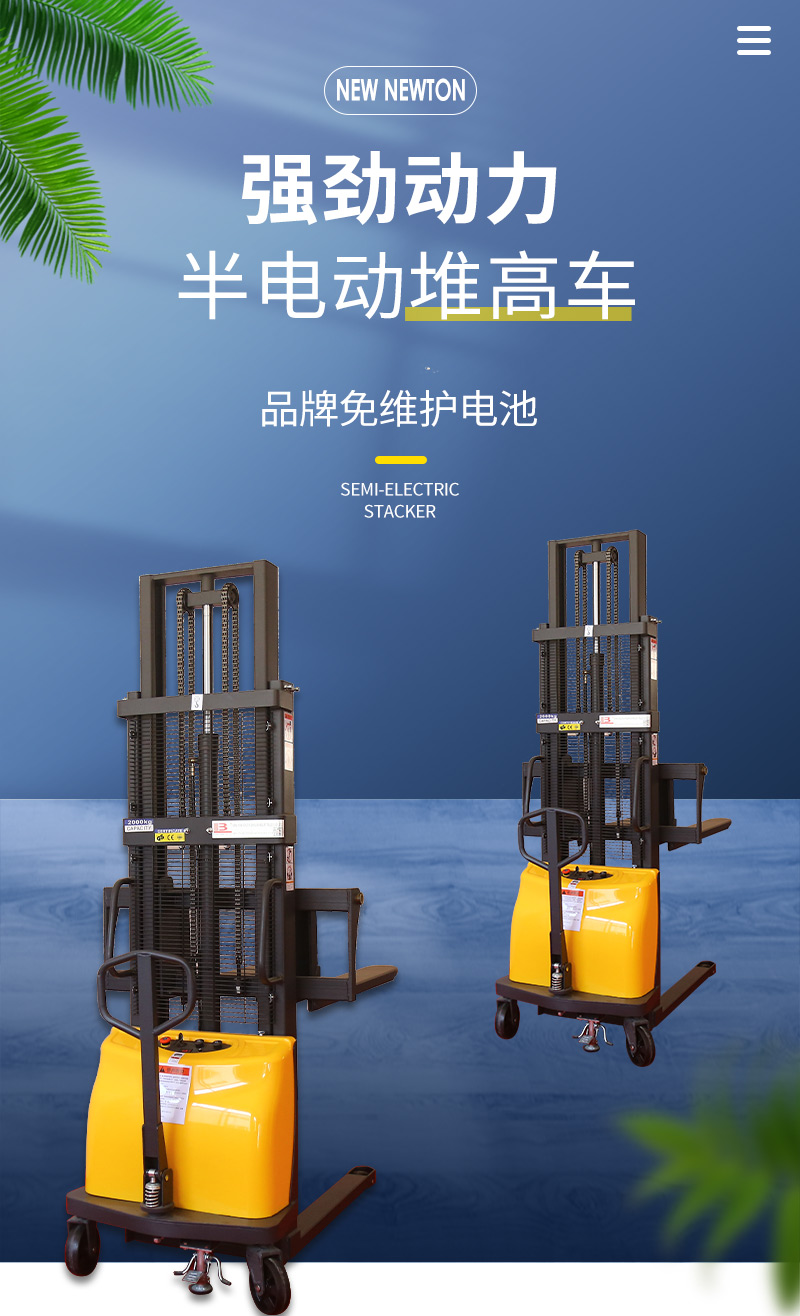 半電動電動堆高車是一款經(jīng)濟實惠的堆高車,配備重載荷油缸,高起升,車體設(shè)計堅固,承載力強。廠家直售,提供批發(fā)電動堆高車價格。半電動電動堆高車采用智能電量顯示儀表,實時監(jiān)測電量。半電動堆高車是電動叉車的一種,是電動升降,人力推拉行走的一款托盤堆垛車。標(biāo)準(zhǔn)載重范圍最大可達2噸,升高3.5米。非標(biāo)可定制寬叉腿,加長貨叉,改三節(jié)門架等.產(chǎn)品規(guī)格: