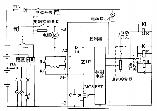 上圖是柯蒂斯 PMC1204/05 型調速控制器控制電動牽引車的電路。圖中電動機的主電路,由蓄電池、電路主熔斷器 FU4、電路接觸器 K 的觸頭、電動機的電樞和磁場、方向接觸器的觸頭、功率晶體管和續流二極管等組成。電路接觸器 K 的觸頭閉合時,接通方向接觸器 F的常開觸頭(同時其常頭斷開驅動電動機的工作電流則由控制器中的 MOSFET 功率晶體管控制,電動機將通電正轉,車輛向前行駛。如下圖所示。