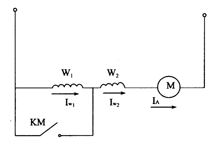 2.電動(dòng)叉車直流串勵(lì)電動(dòng)機(jī)改變勵(lì)磁電流IW調(diào)速。電路如圖二所示,電動(dòng)機(jī)的勵(lì)磁繞組由相同的兩個(gè)分段 W1及 W2構(gòu)成,通過 W1與W2的并聯(lián)換接,以改變勵(lì)磁電流實(shí)現(xiàn)調(diào)速。
